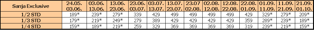 Za sopstveni prevoz cena aranžmana se umanjuje za 30€ po osobi, a 20€ za smene označene ZVEZDICOM (*)