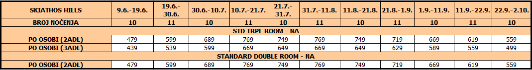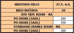 – avio – čarter let na relaciji Beograd – Skiatos – Beograd sa obrokom tokom leta. Let br.JU9142/3, u 06:05-08:25/09:10-09:35 (planirano vreme) i let br.JU9140/1, u 06:05-08:25/09:10-09:35 (planirano vreme). Ukoliko nacionalni prevoznik promeni datume leta i agencija zadržava pravo promene istog.