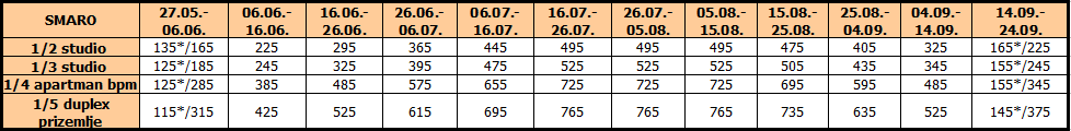 Cene su izražene u eurima po studiju/apartmanu na bazi najma za 10 noćenja