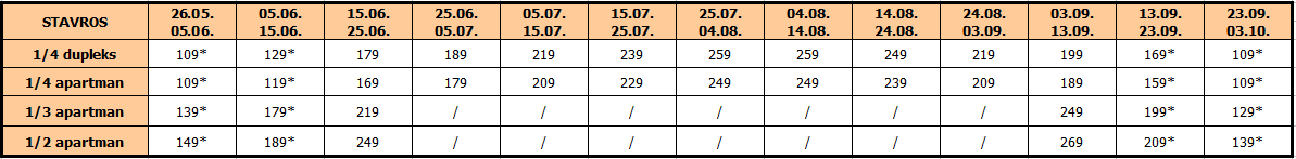 Smeštaj: Vila Stavros raspolaže apartmanima i dupleksima za smeštaj do 4 osobe. Smeštajne jedinice su raspoređene u prizmlju, prvom, drugom i trećem spratu. Neke smeštajne jedinice su kompletno renovirane. Sve smeštajne jedinice imaju čajnu kuhinju sa posuđem, terasu sa garniturom za sedenje, SAT TV, klima uređaj (korišćenje uz doplatu 5 evra dnevno), besplatni WiFi internet, balkon. Promena posteljine jednom tokom boravka. Vila nema peškire i gosti sami održavaju higijenu studija.