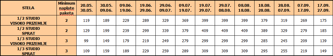 Cene u tabeli su izražene na bazi najma po studiju/apartmanu za 10 noćenja.