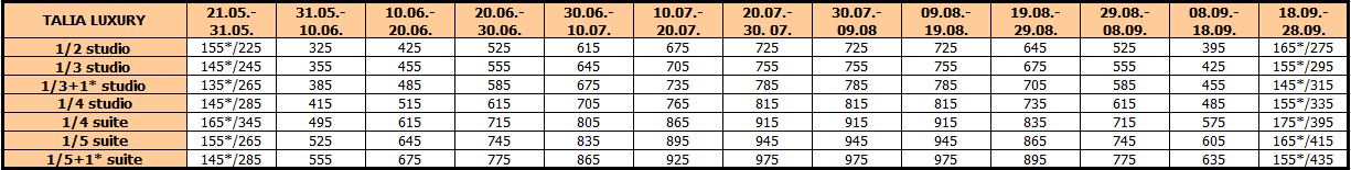 Cene su izražene u eurima po studiju/apartmanu na bazi najma za 10 noćenja