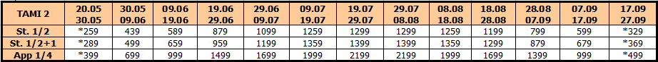 Cene su izražene u evrima po studiju / apartmanu, najam za 7 noćenja