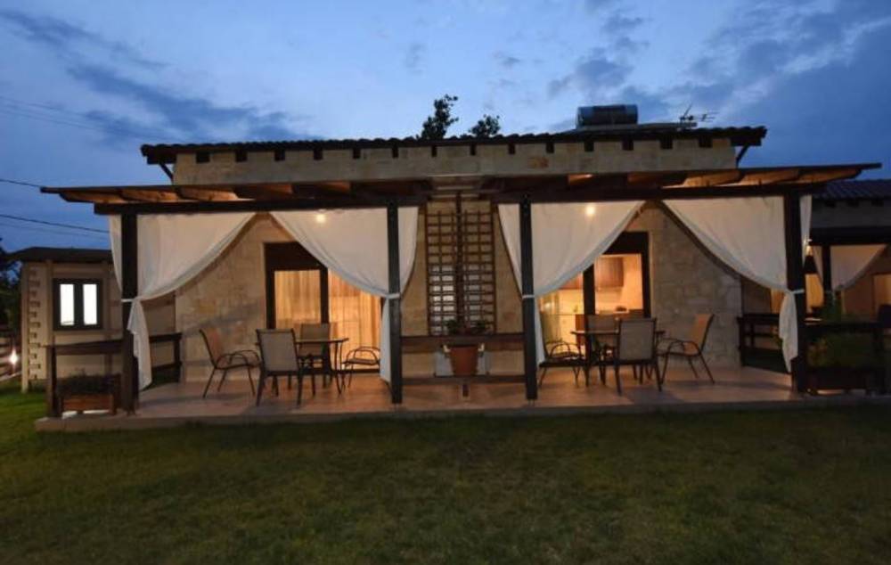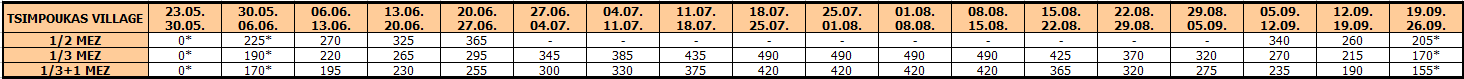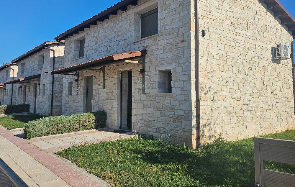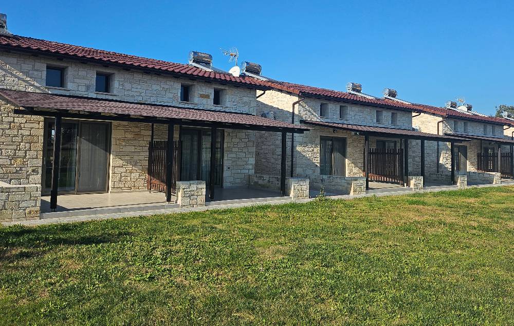 Tsimpoukas Village (Cimbukas kompleks) se sastoji od 4 zasebne kamene kuće u nizu i svaka je podeljena na dve mezonete, odnosno smeštajne jedinice sa galerijom. Objekat je novijeg datuma i spada u jedan od najlepših i najkvalitetnijih turističkih objekata u Nea Flogiti. Izgradjen je u tradicionalnom stilu od prirodnih materijala, u isto vreme moderno opremljen i sa vrlo kvalitetnim nameštajem. Nalazi se u mirnom i tihom delu letovališta, na svega oko 300 metara metara od lepe, velike peščane plaže. Komplek pored navedenih objekata ima sopstveni parking za sva vozila gostiju, veliko travnato dvorište i zajednički, veliki zidani roštilj sa tremom. Zbog svega navedenog predstavlja pravi razlog za lep i opuštajući boravak porodica, naročito sa malom decom. Sve mezonete su identične, nalaze se u prizemlju sa velikom lepom terasom pokrivenom pergolom i sa direktnim izlazom u dvorište – vrt. Mezonete 1/3 +1 se sastoje od prizemlja gde se nalazi sofa dimenzija i kvaliteta standardnog ležaja i pomoćni ležaj za dete do 12 godina, kuhinjskog dela sa trpezarijskim stolom, kupatila sa tuš kabinom i terase sa garniturom za sedenje. Na galeriji, do koje vode standardne stepenice, nalazi se francuski ležaj. Veličina mezonete je cca 32 kvm + terasa. Sve mezonete su opremljene jednim klima uredjajem (uračunat u cenu), wi – fi Internetom, fenom i TV-om. Tsimpoukas Village (Cimbukas kompleks) je visoke A kategorije i ima peškire.