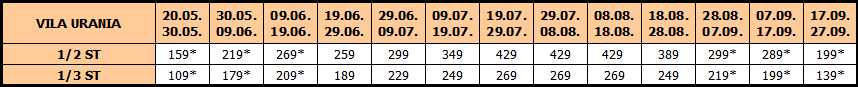 Cene označene zvezdicom* iskazane su po osobi i obuhvataju smeštaj i prevoz. U slučaju sopstvenog prevoza u smenama sa * cena se umanjuje za 20 eur po osobi od ukupne vrednosti aranžmana.