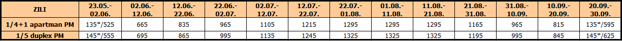 -Kod prodaje duple smene – prva smena gde je cena sa zvezdicom (*) i narednog termina, putnik plaća paket po osobi plus najam apartmana u sledećoj smeni. Isto važi i za poslednju smenu sa zvezdicom (*).