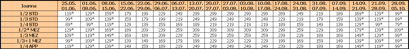 Za sopstveni prevoz cena aranžmana se umanjuje za 30€ po osobi, a 20€ za smene označene ZVEZDICOM (*)