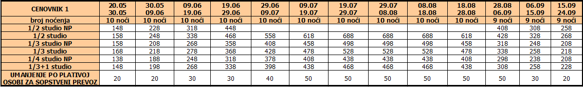 Cene iz tabele predstavljaju cenu paket aranžmana (smeštaj + prevoz) po osobi.