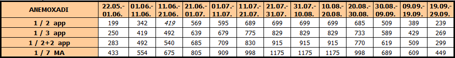 Sedmokrevetna mezoneta Anemoxadi se sastoji od dva nivoa, na prvom spratu se nalazi dnevni boravak (TV) sa ugaonom garniturom koja se razvlači, kuhinjom, WC-om i dve terase. Stepenicama se sa prvog sprata odlazi na drugi sprat, na kom se nalaze dve spavaće sobe, u jednoj se nalaze dva grčko-francuska tipa ležaja (190x120cm) i jedan singl ležaj, u drugoj spavaćoj sobi se nalazi grčko-francuski tip ležaja (190x120cm). Obe spavaće sobe na drugom spratu imaju terase. Na drugom spratu se nalazi kupatilo sa kadom.