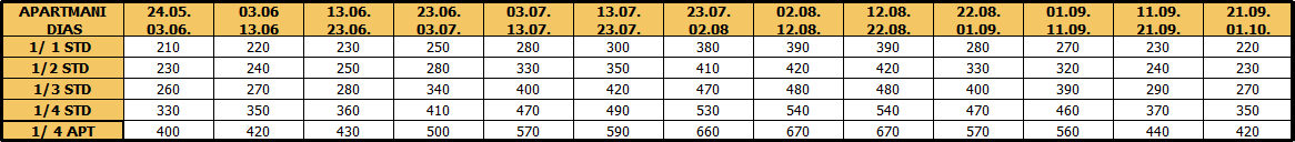 – Najam apartmana u predviđenim terminima iz tabela u SEZONI. (kada putnik koristi autobuski prevoz). Ukoliko stranke koriste sopstveni prevoz mogu sami izabrati termine i trajanje boravka.
