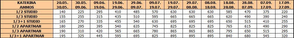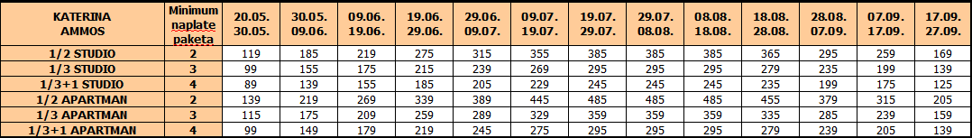 Cene u tabeli su izražene na bazi najma po studiju/apartmanu za 10 noćenja.