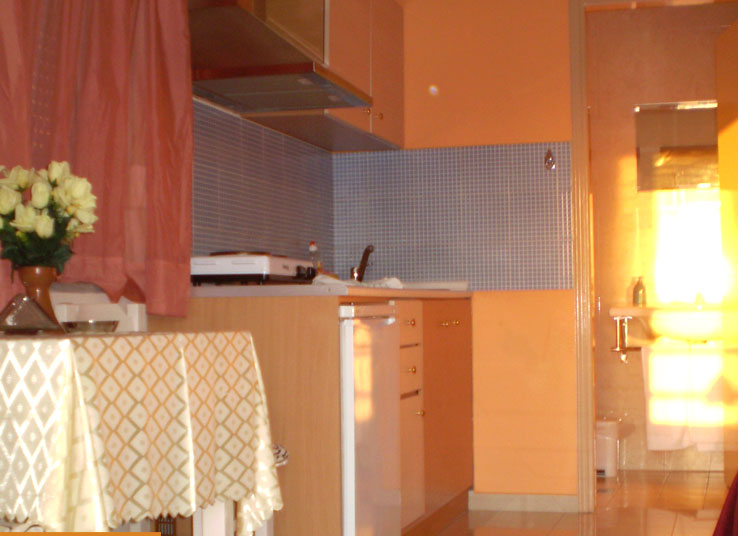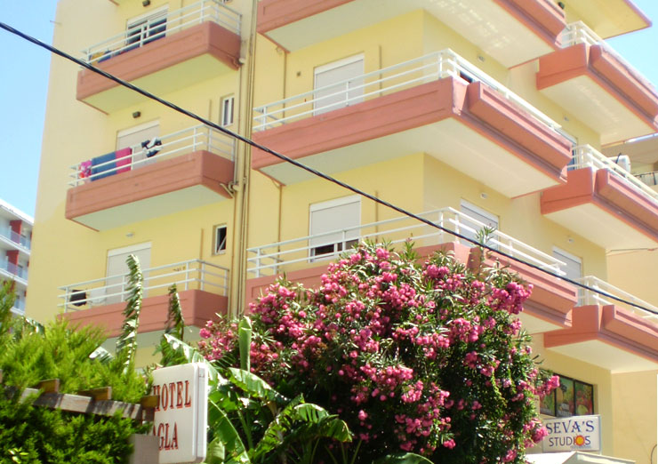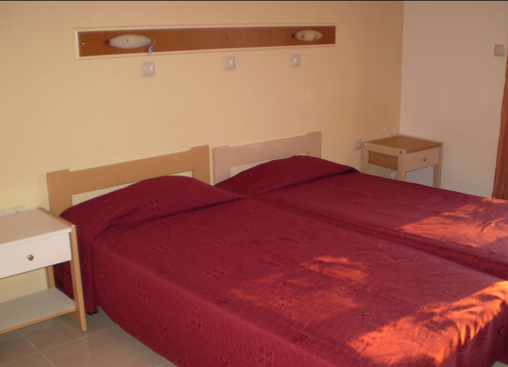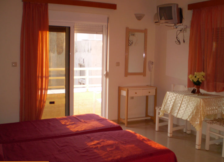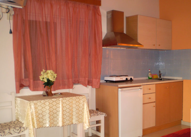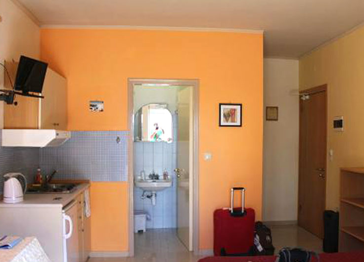 Nalazi se u mirnom delu grada Rodosa, na zapadnoj obali ostrva. Od šljunkovite plaže su udaljeni 50 m od koje ih deli ulica, a centar grada i pešačka zona su udaljeni oko 600 m. Od aerodroma je udaljen 14 km. Studija se sastoje od sobe sa krevetima za dve osobe, kuhinjske niše (osnovno posuđe, mini šporet sa dve ringle, frižider), kupatilo (tuš/wc), fen, TV, klima uređaj i balkon. Peškiri i posteljina se menjaju jednom u toku boravka.
