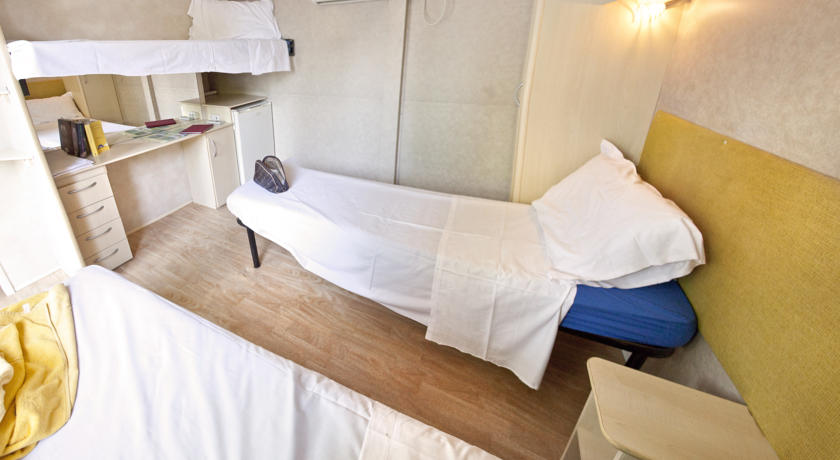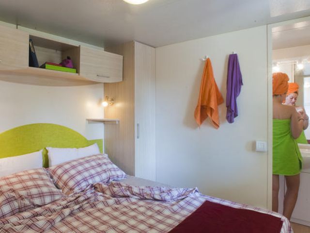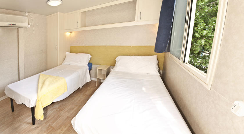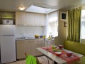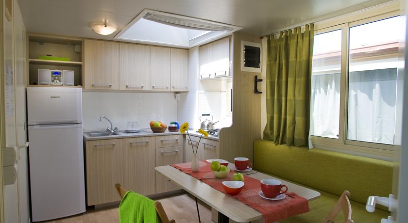 Chalet: mobilna kućica sa 2 sobe, u jednoj se nalaze 2 odvojena ležaja i 3. krevet na sprat, a u drugoj bračni ležaj, potpuno opremljena kuhinja, 2 kupatila, klima, frižider.