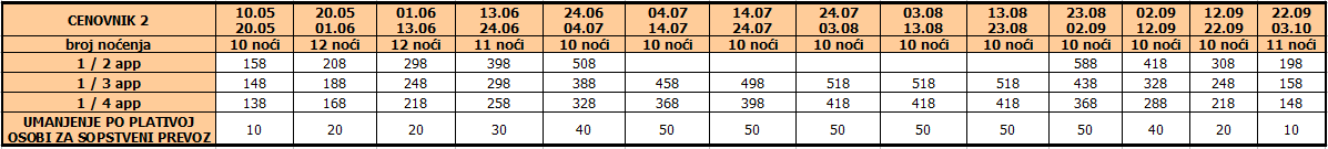 Cene iz tabele predstavljaju cenu paket aranžmana (smeštaj + prevoz) po osobi.