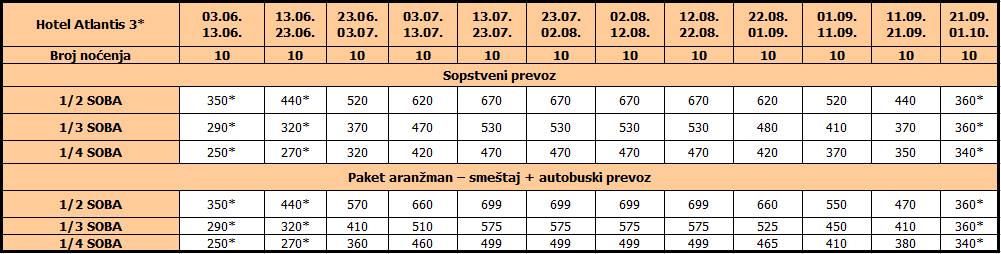 Cene iz tabele su izražene u evrima po osobi na bazi 10 noćenja sa polupansionom