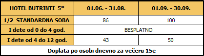 – Izabrane pansionske usluge i broj noćenja (minimalno 5 noćenja) u hotelu prema tabeli. Putnici sami biraju termin i broj dana.