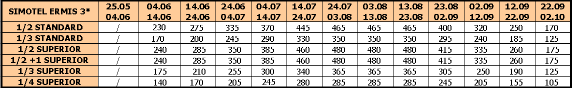 Cene su izražene u evrima po osobi, smeštaj 10 noćenja (usluga noćenje sa doručkom)
