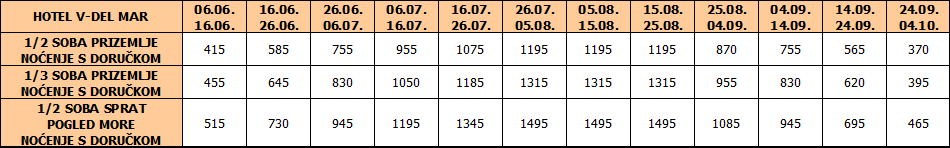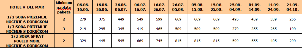Cene u tabeli su izražene na bazi noćenja sa doručkom po sobi za 10 noćenja.