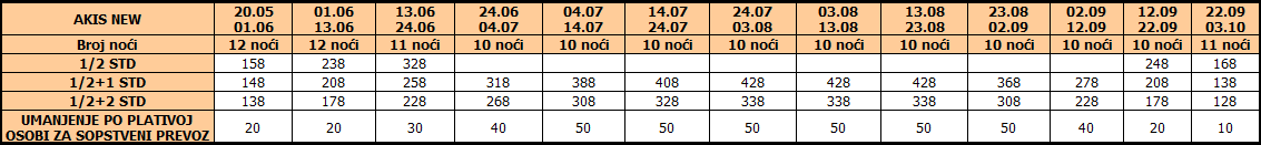 Cene iz tabele predstavljaju cenu paket aranžmana (smeštaj + prevoz) po osobi.