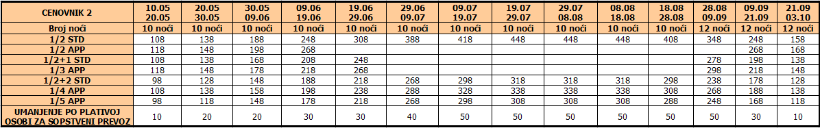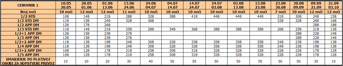 Cene iz tabele predstavljaju cenu paket aranžmana (smeštaj + prevoz) po osobi.