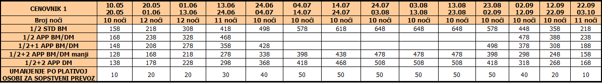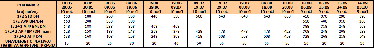 Cene iz tabele predstavljaju cenu paket aranžmana (smeštaj + prevoz) po osobi.