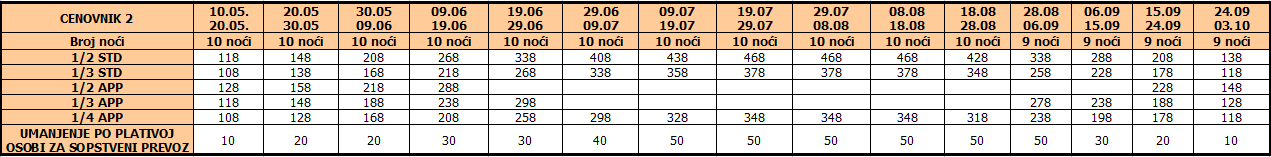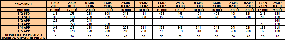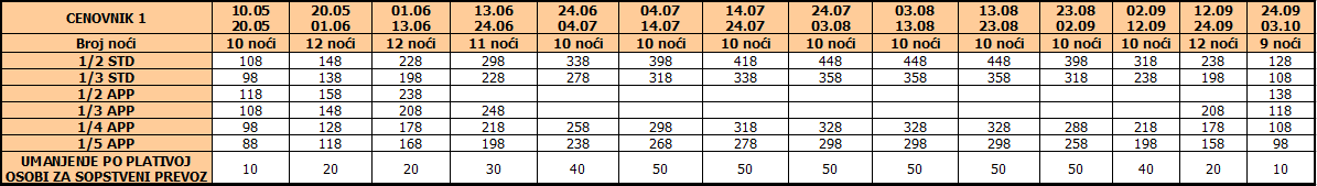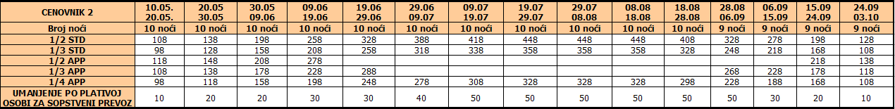 Cene iz tabele predstavljaju cenu paket aranžmana (smeštaj + prevoz) po osobi.
