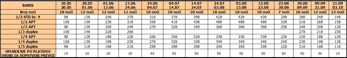 Cene iz tabele predstavljaju cenu paket aranžmana (smeštaj + prevoz) po osobi.