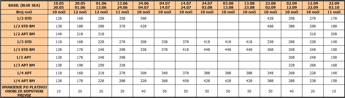 Cene iz tabele predstavljaju cenu paket aranžmana (smeštaj + prevoz) po osobi.