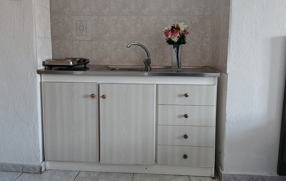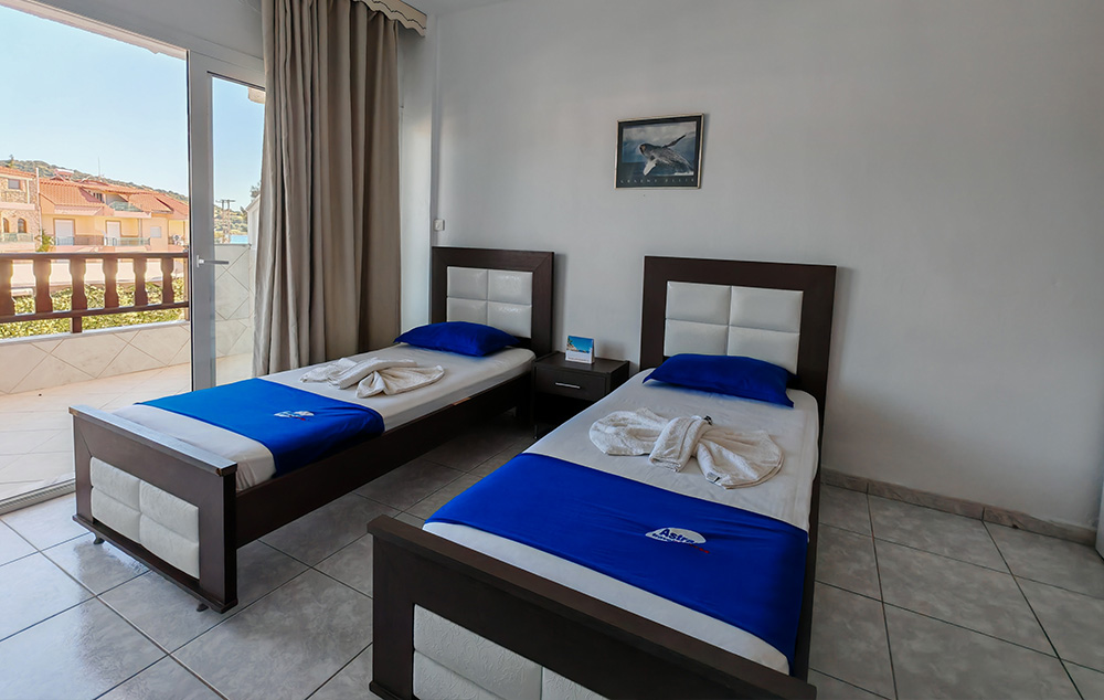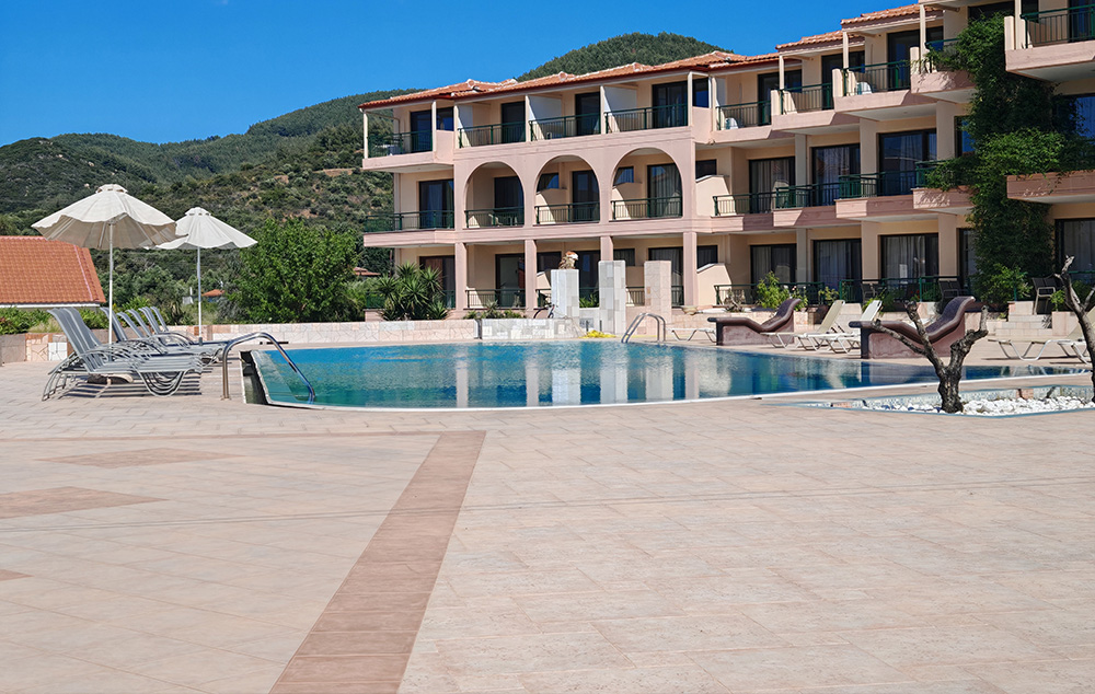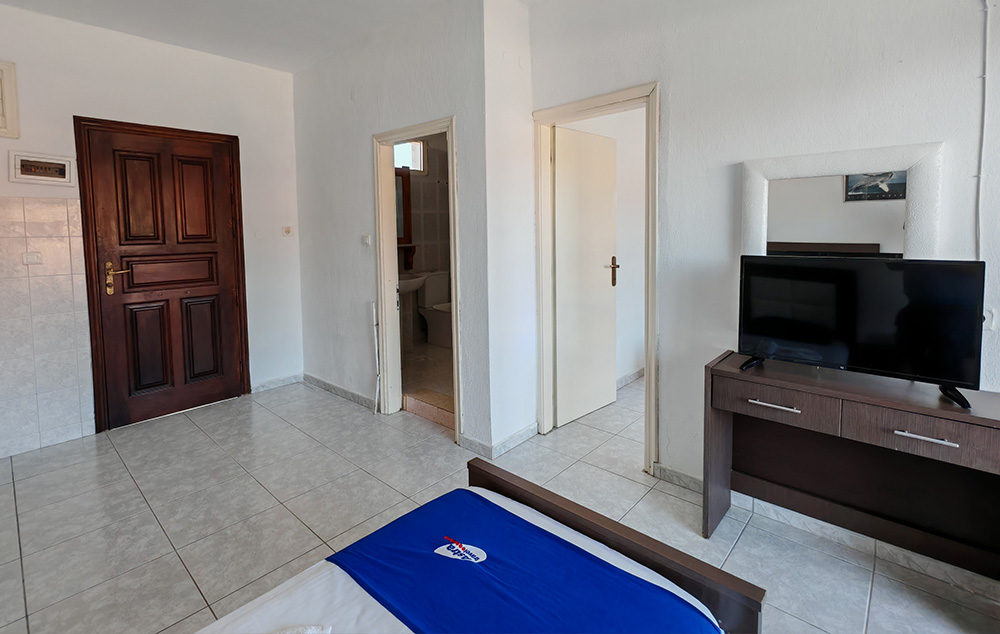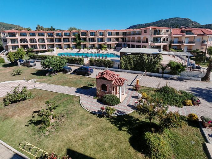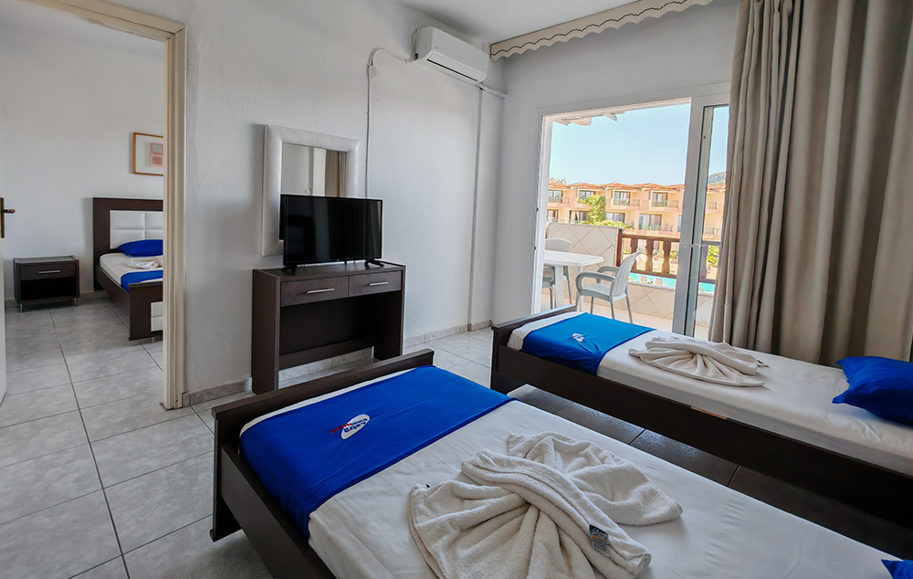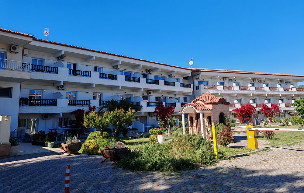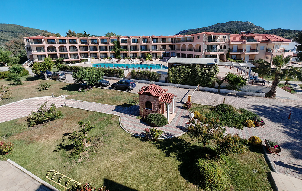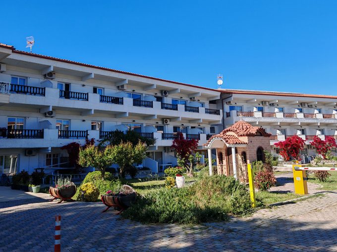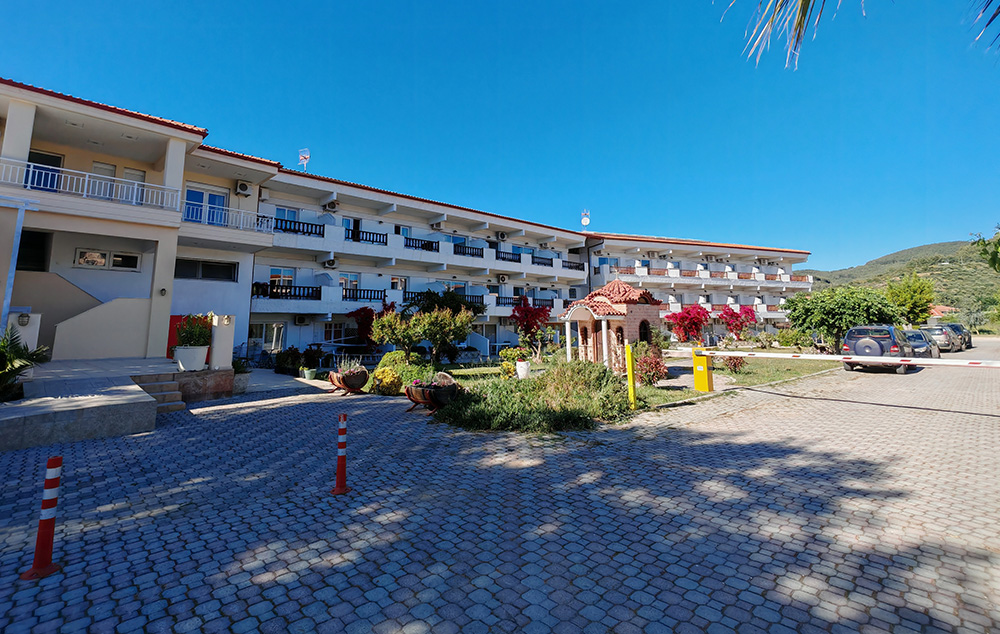 Nalazi se na samoj plaži, u sklopu hotela Blue Sea. U ponudi su studiji i apartmani za 2-4 osobe koji se nalaze u prizemlju, na prvom i drugom spratu. Jedni su sa bočnim pogledom na more, a drugi povoljniji nemaju pogled na more. Sve smeštajne jedinice imaju TV i klima uređaj čije je korišćenje uključeno u cenu. Gostima su na raspolaganju veliki i dečiji bazen uz konzumaciju pića, kao i parking. Moguća je doplata polupansiona u hotelskom restoranu.