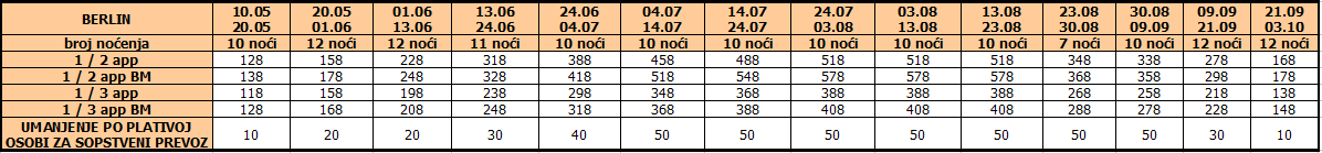 Cene iz tabele predstavljaju cenu paket aranžmana (smeštaj + prevoz) po osobi.