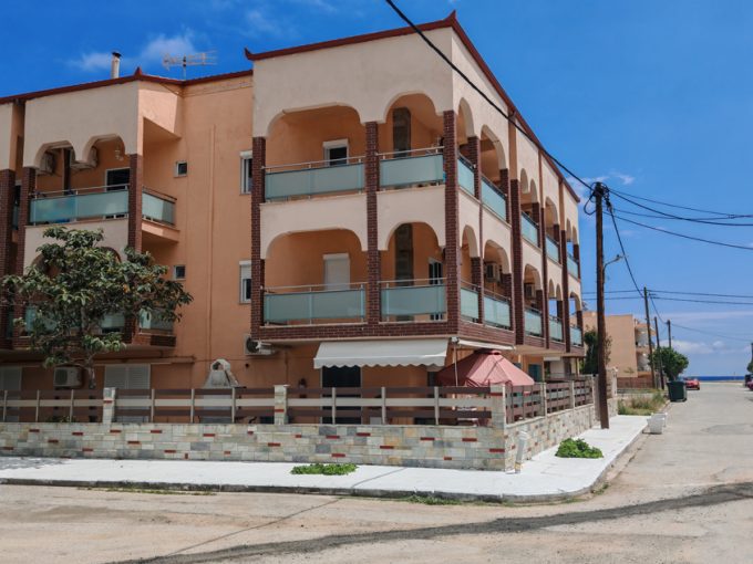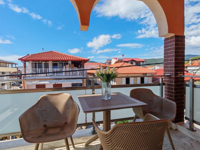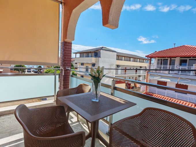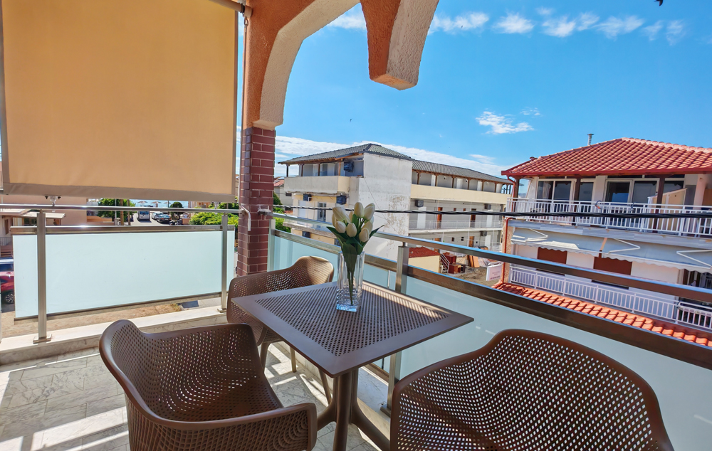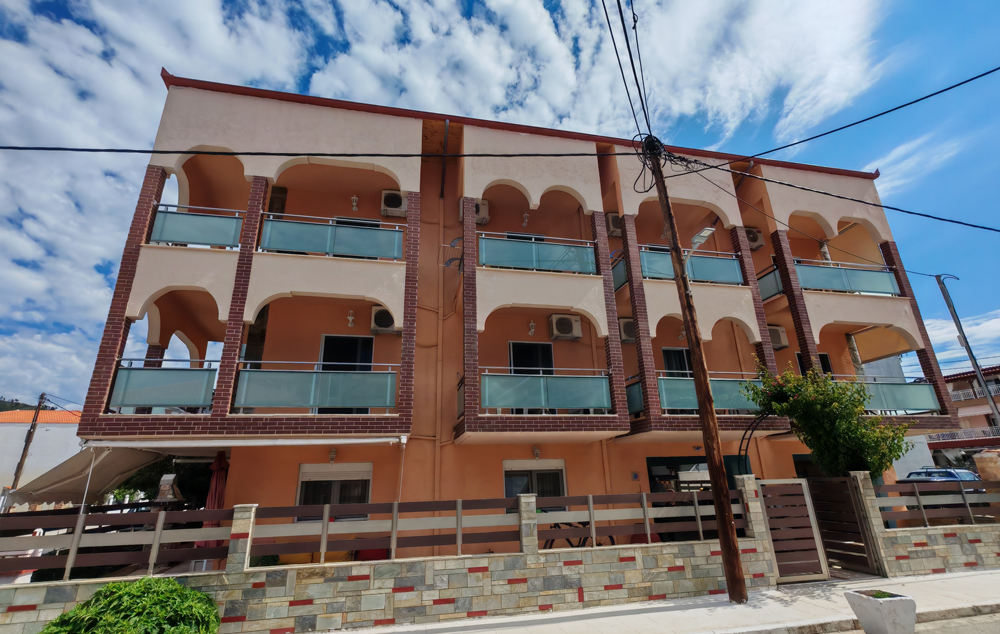 Nalazi se u novom delu Sartija na oko 80m od najlepšeg dela peščane plaže u Sartiju. Apartmani za 2 ili 3 osobe se nalaze na drugom spratu, a glavni kvalitet je kuhinja odvojena od spavaće sobe kao i zajednički prostor u prizemlju koristan na dan povratka. Kuća ima SAT TV, signal za besplatan bežični internet i klima uređaje čije se korišćenje posebno doplaćuje. Neki od apartmana imaju bočni pogled na more.