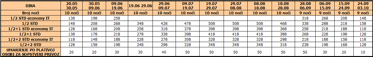 Cene iz tabele predstavljaju cenu paket aranžmana (smeštaj + prevoz) po osobi.