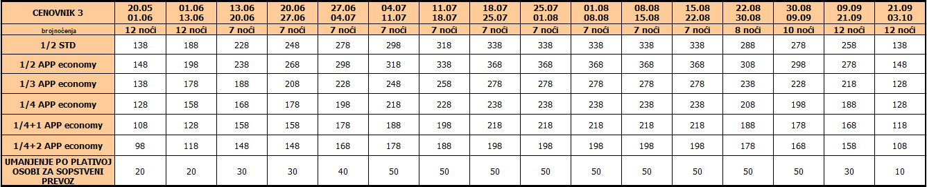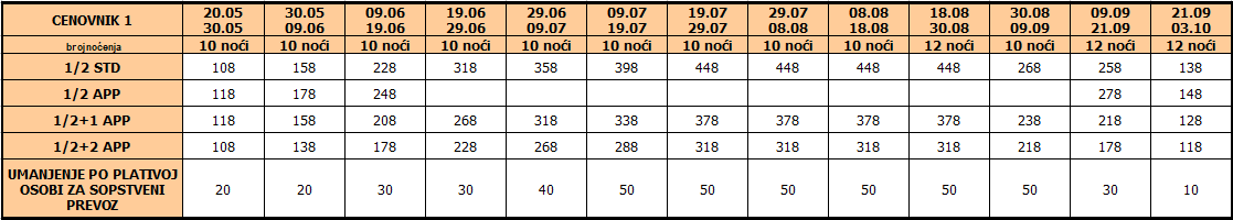 Cene iz tabele predstavljaju cenu paket aranžmana (smeštaj + prevoz) po osobi.