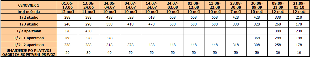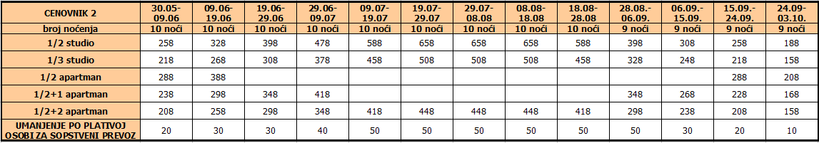 Cene iz tabele predstavljaju cenu paket aranžmana (smeštaj + prevoz) po osobi.