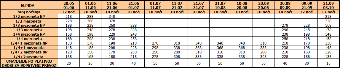 Cene iz tabele predstavljaju cenu paket aranžmana (smeštaj + prevoz) po osobi.