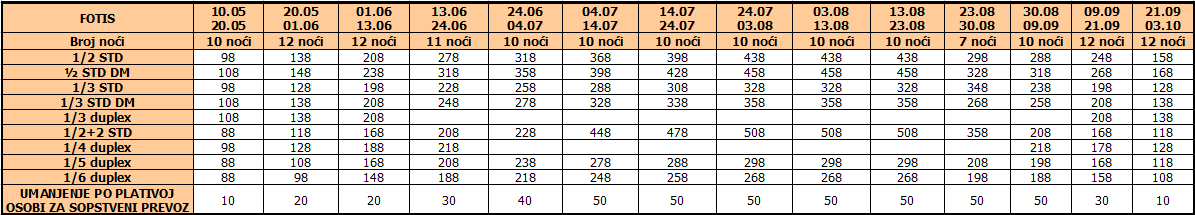 Cene iz tabele predstavljaju cenu paket aranžmana (smeštaj + prevoz) po osobi.