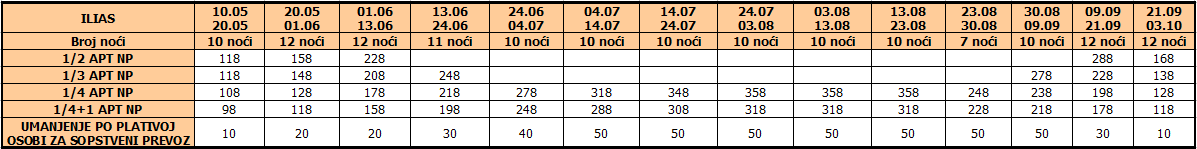Cene iz tabele predstavljaju cenu paket aranžmana (smeštaj + prevoz) po osobi.