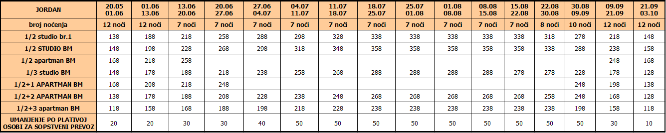 Cene iz tabele predstavljaju cenu paket aranžmana (smeštaj + prevoz) po osobi.