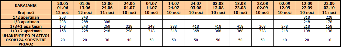 Cene iz tabele predstavljaju cenu paket aranžmana (smeštaj + prevoz) po osobi.