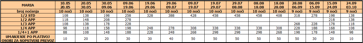 Cene iz tabele predstavljaju cenu paket aranžmana (smeštaj + prevoz) po osobi.