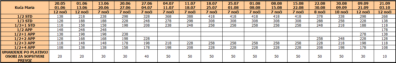 Cene iz tabele predstavljaju cenu paket aranžmana (smeštaj + prevoz) po osobi.