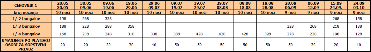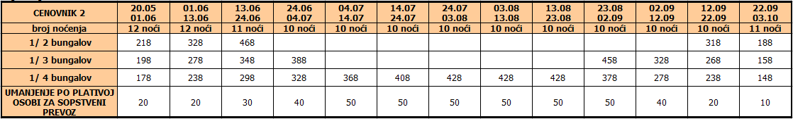 Cene iz tabele predstavljaju cenu paket aranžmana (smeštaj + prevoz) po osobi.