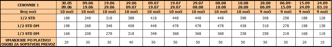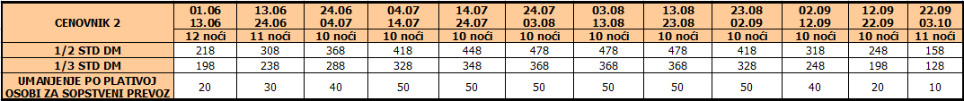 Cene iz tabele predstavljaju cenu paket aranžmana (smeštaj + prevoz) po osobi.