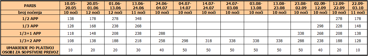 Cene iz tabele predstavljaju cenu paket aranžmana (smeštaj + prevoz) po osobi.