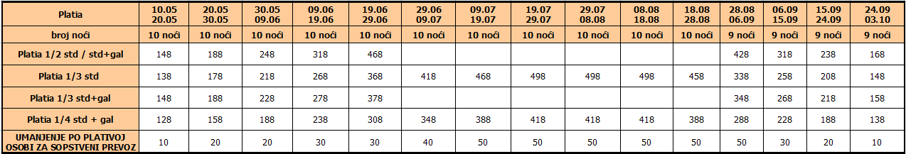 Cene iz tabele predstavljaju cenu paket aranžmana (smeštaj + prevoz) po osobi.