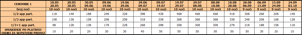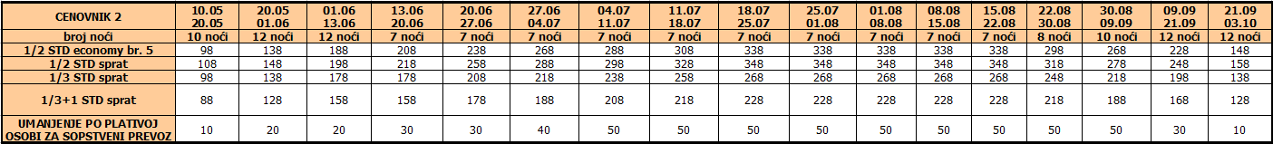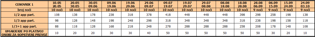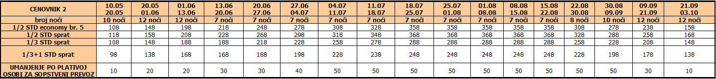 Cene iz tabele predstavljaju cenu paket aranžmana (smeštaj + prevoz) po osobi.