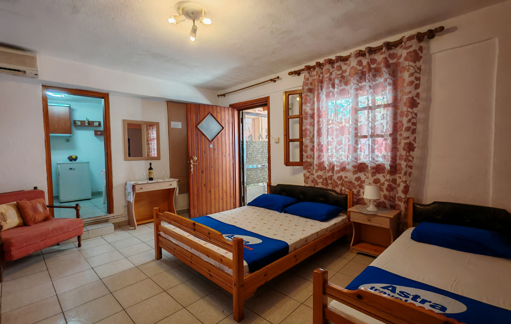 Nalazi se na oko 180m od plaže u starom i mirnom delu Sartija. U prizemlju, uvučeni od ulice, nalaze se apartmani koji su za 3-4 osobe, dok se studiji za 2-3 osobe nalaze na prvom spratu. Kuća ima signal za besplatno korišćenje bežičnog interneta, a smeštajne jedinice imaju TV i klima uređaj čije se korišćenje doplaćuje. Jedino je u studiju br.5 klima uključena u cenu, i ovaj studio je nešto manje kvadrature, koji ima izdvojenu terasu.