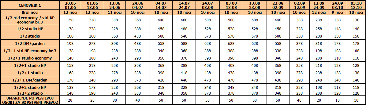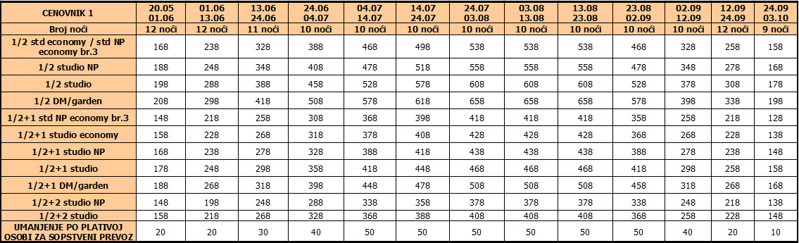 Cene iz tabele predstavljaju cenu paket aranžmana (smeštaj + prevoz) po osobi.