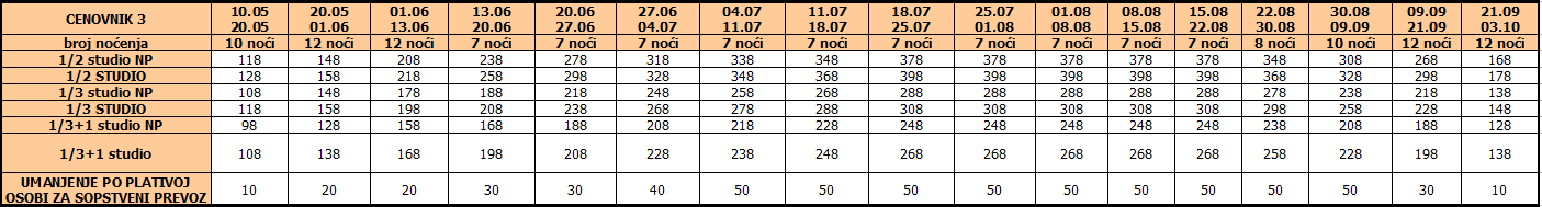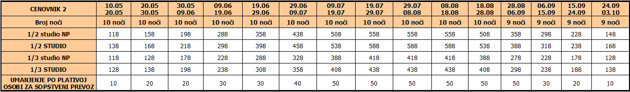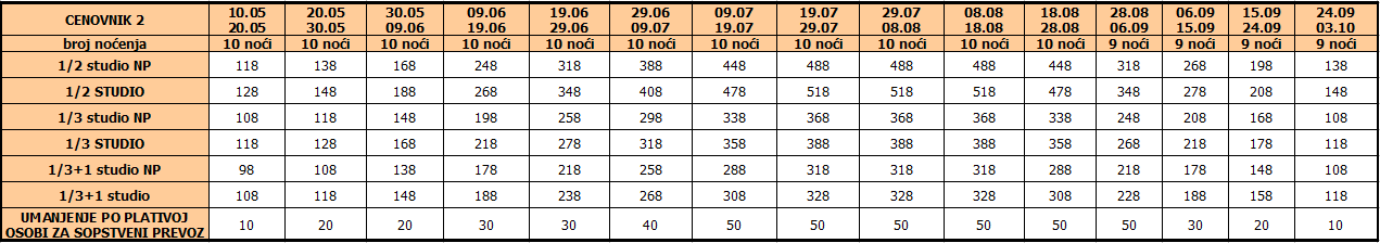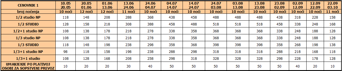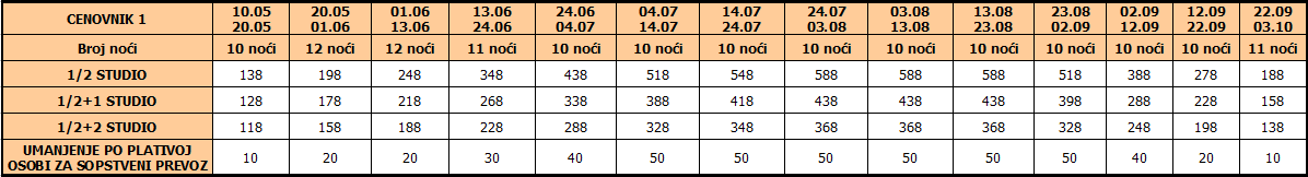 Cene iz tabele predstavljaju cenu paket aranžmana (smeštaj + prevoz) po osobi.