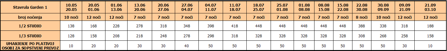 Cene iz tabele predstavljaju cenu paket aranžmana (smeštaj + prevoz) po osobi.